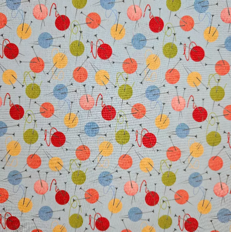 Farge: Himmelblå med garnnøster i ulike farger og med pinner.