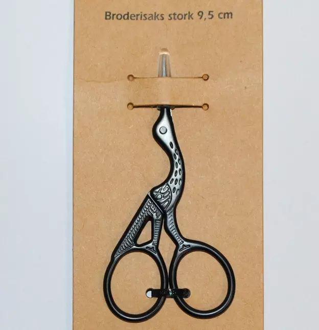 Broderisaks i svart fra Villy Jensen som måler 9,5cm. Bladene måler ca. 5cm fra dreiepunktet. Saksen er spiss i tuppen og kommer med en plastbeskyttelse.