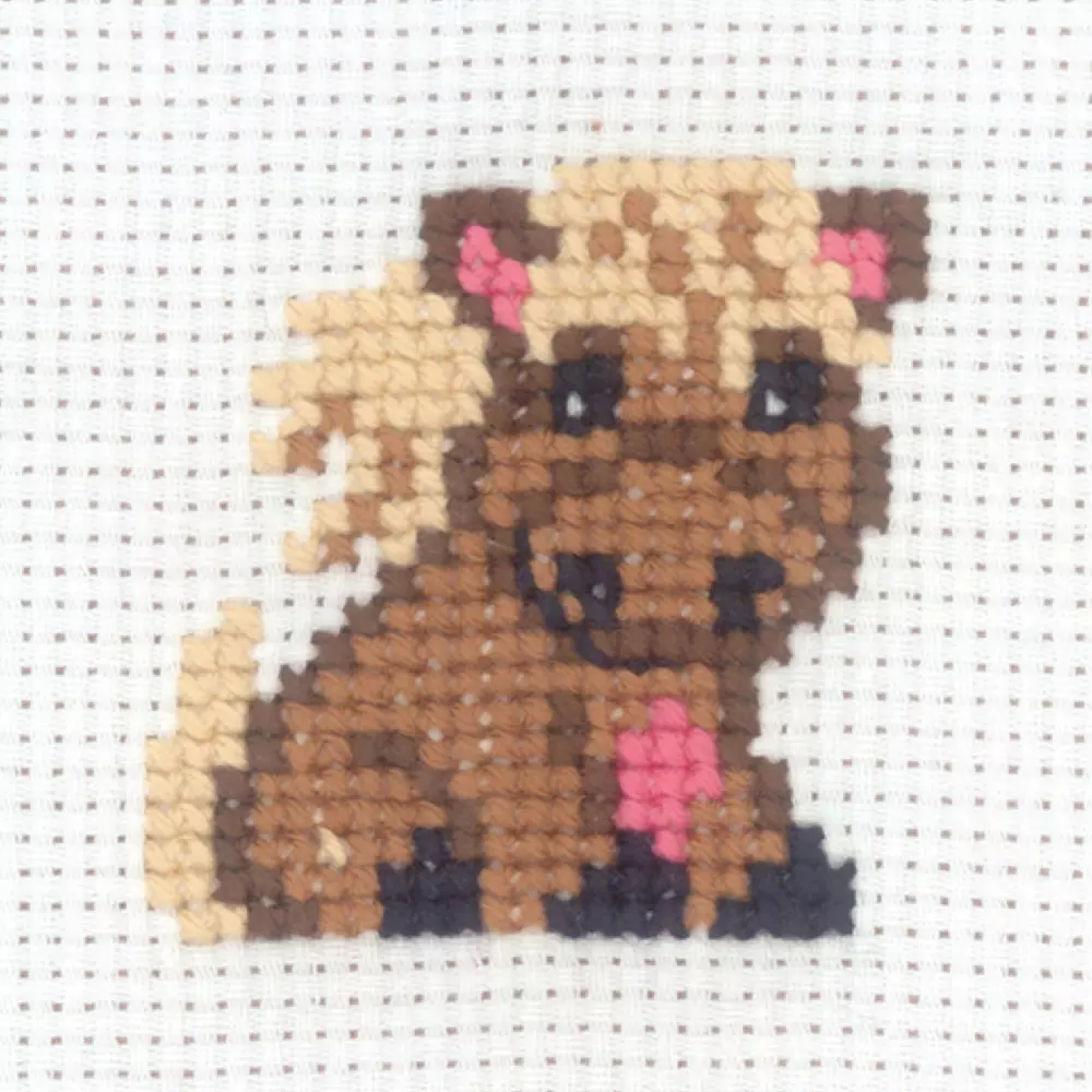 My First Kit broderipakke i korssting fra Permin til barn/nybegynnere med motiv av en brun hest med beige man. Broderiets ferdige mål er ca. 8 x 8cm.
