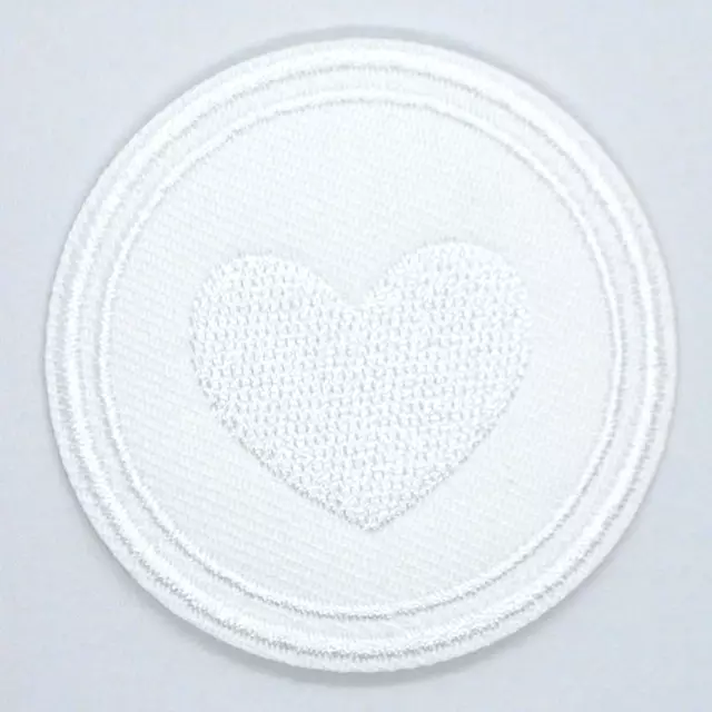 Sirkelformet strykemotiv med hjerte i hvit farge.