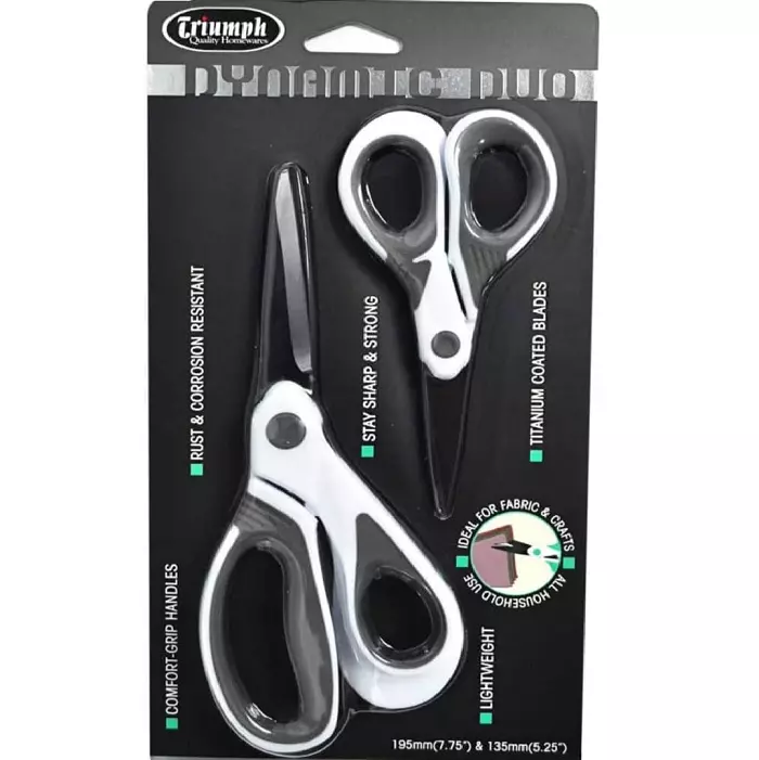 Sett med sysaks og en universalsaks fraTriumph. Saksene er fremstilt i titanium. Det er softgrip på innsiden av håndtaket hvilket gir godt grep.