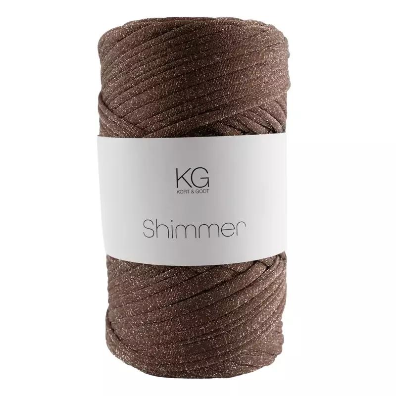 Shimmer garn fra Kort & Godt er et elastisk bånd-/lissegarn med glitter som egner seg utmerket til strikking, hekling og macramé. Passer godt til for eksempel vesker, kurver, puter og matter. Garnet er laget av en oppskjært stoffstrimmel som ruller seg på kantene og gjør at tråden oppleves som mer rund enn flat.