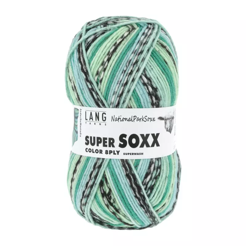 Super soxx color 8ply fra Lang Yarns er et 8-tråds flerfarget, nylonsforsterket sokkegarn i 150 grams nøster.