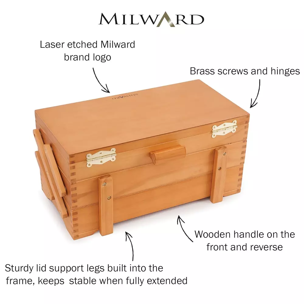 Praktisk syskrin fra Milward i furu med 3 nivåer. En meget pen og praktisk måte å oppbevare sitt sytilbehør. Syskrinet har 3 rom, det øverste av disse er inndelt i midndre deler. De to nederste rommene