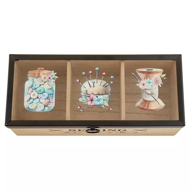 En praktisk boks produsert i MDF+ finer med et akryllokk m/ metalramme. Boksen er delt i 3. På lokket er det 4-farget printet design med knappeglass, nålepute og sytrådspole. Det gjennomsiktige lokket gjør at boksen er velegnet til å oppbevare div. sytilbehør.